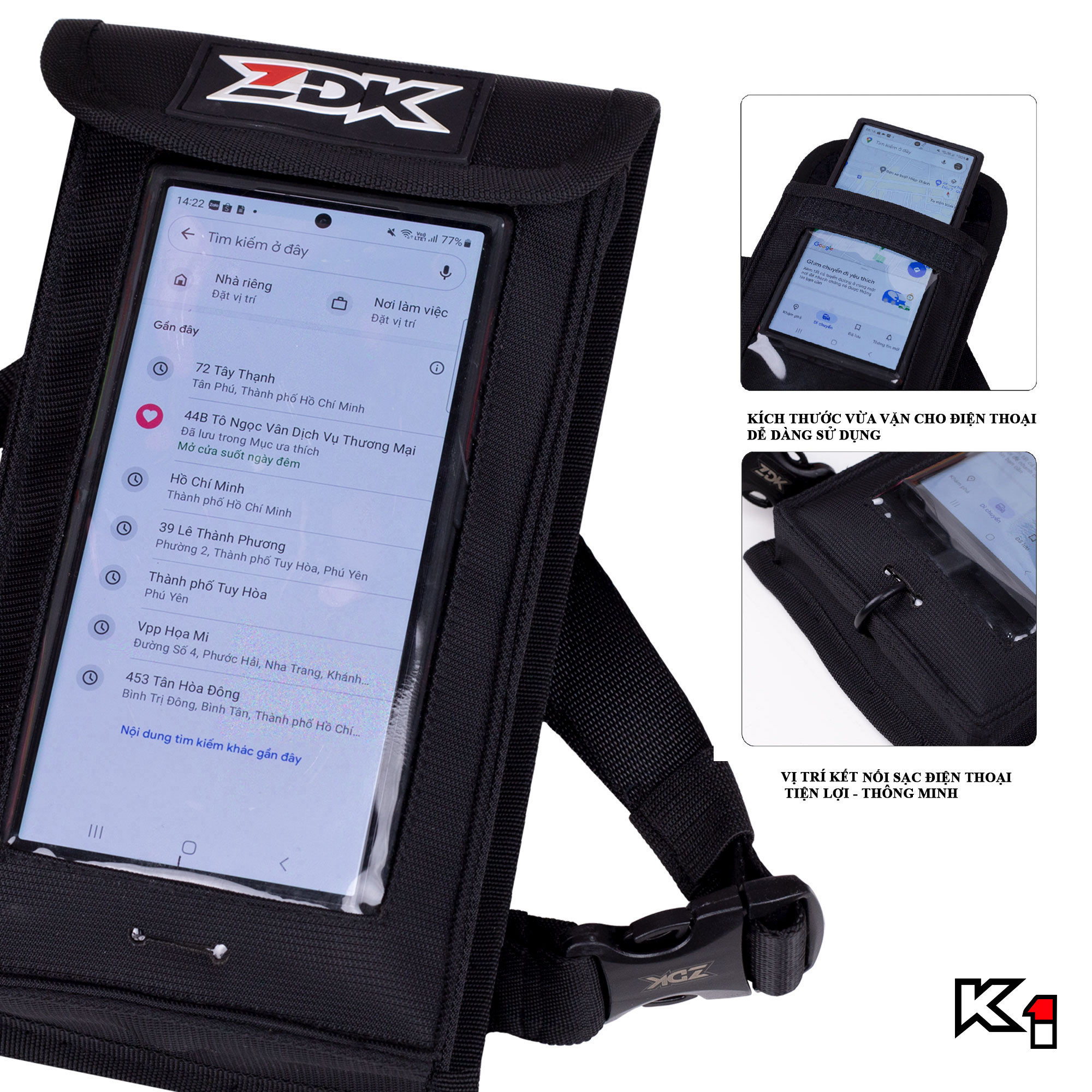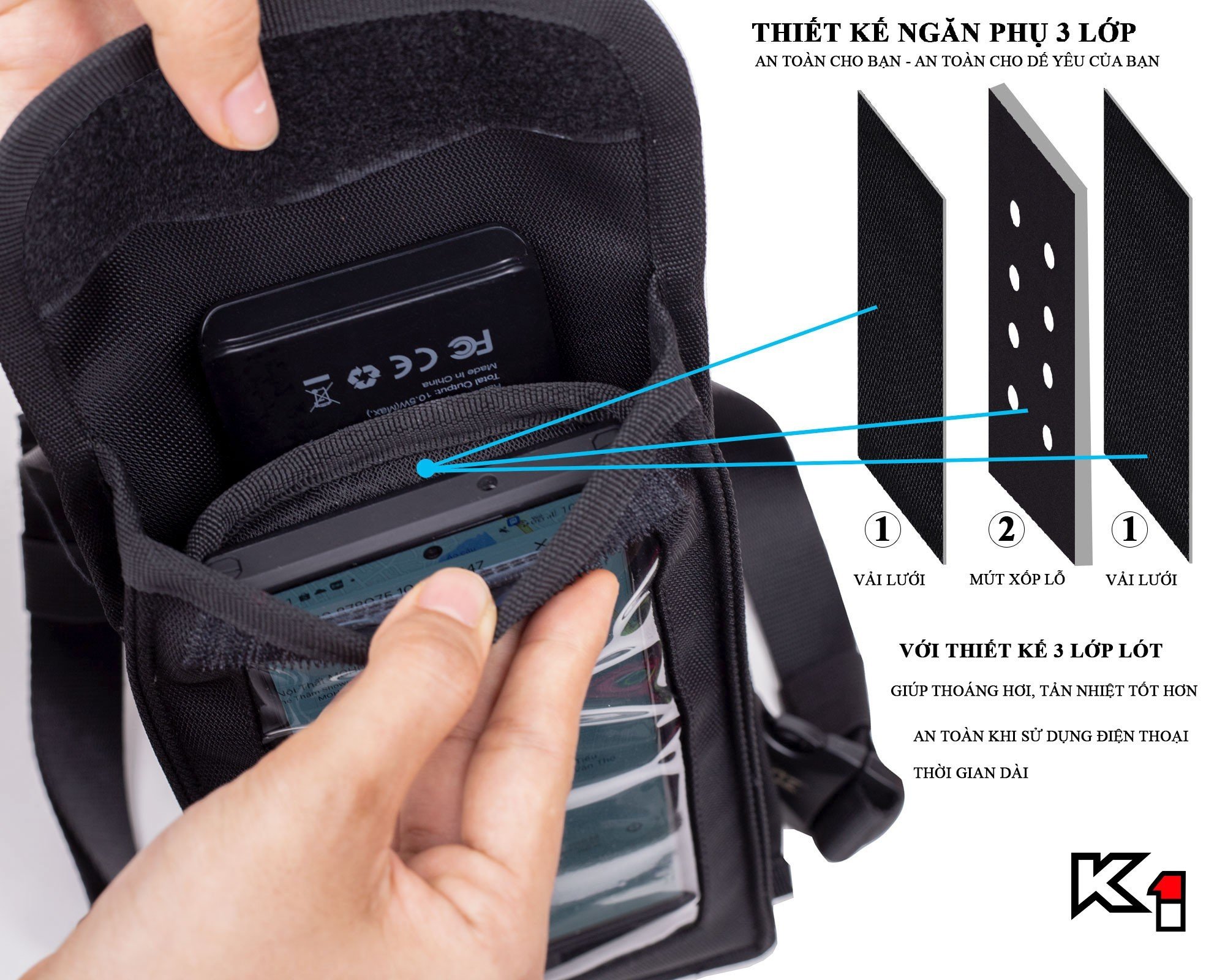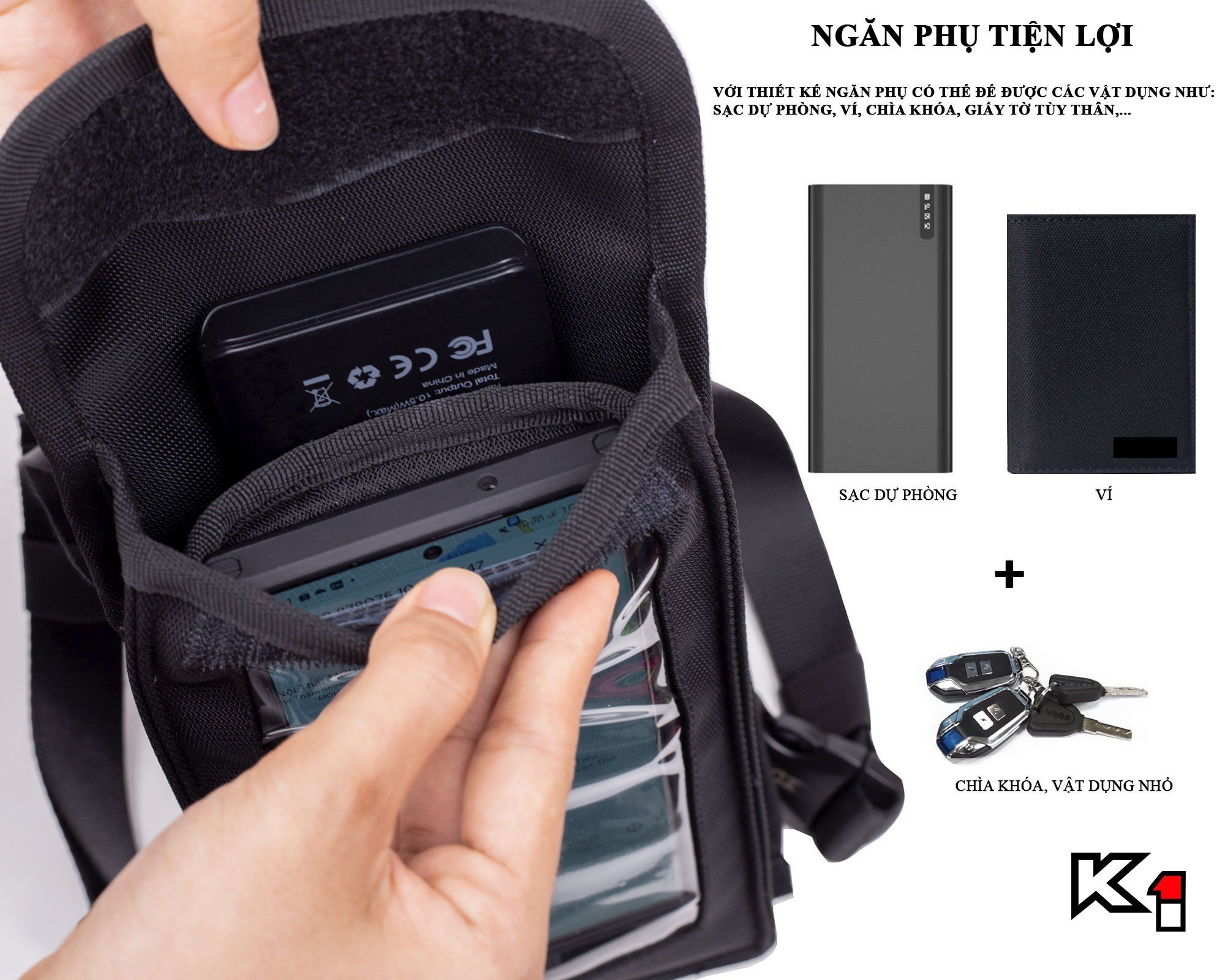 – Túi gồm 2 ngăn: 1 ngăn để điện thoại + 1 ngăn để ví, cáp sạc, sạc dự phòng